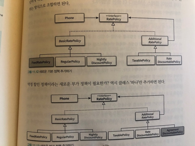 클래스 폭발 문제를 해결하기 위해 합성을 사용하는 이유는 런타임에 객체 사이의 의존성을 자유롭게 변경할 수 있기 때문이다. 합성을 사용하면 구현 시점에 정책들의 관계를 고정시킬 필요가 없으며 실행 시점에 정책들의 관계를 유연하게 변경할 수 있게 된다.