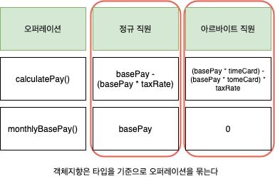 }객체지향에서는 타입 변수를 이용한 조건문을 다형성으로 대체한다. 객체가 메시지를 처리할 적절한 메서드를 선택하게 된다.